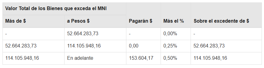 El gravamen a ingresar será el que resulte de aplicar, sobre el valor total de los bienes situados en el país y en el exterior sujetos al impuesto, excepto las acciones y participaciones que deban ser declaradas por las personas jurídicas en carácter de responsables sustitutos, que exceda de $ 384.728.044,57, la siguiente escala: